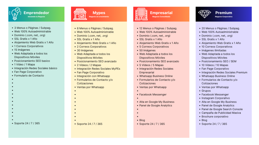 Nuestros planes son Emprendedor (Iniciando tu negocio), MyPEs (Negocio en Crecimiento), Empresarial (Empresas Consolidadas) y Premium.